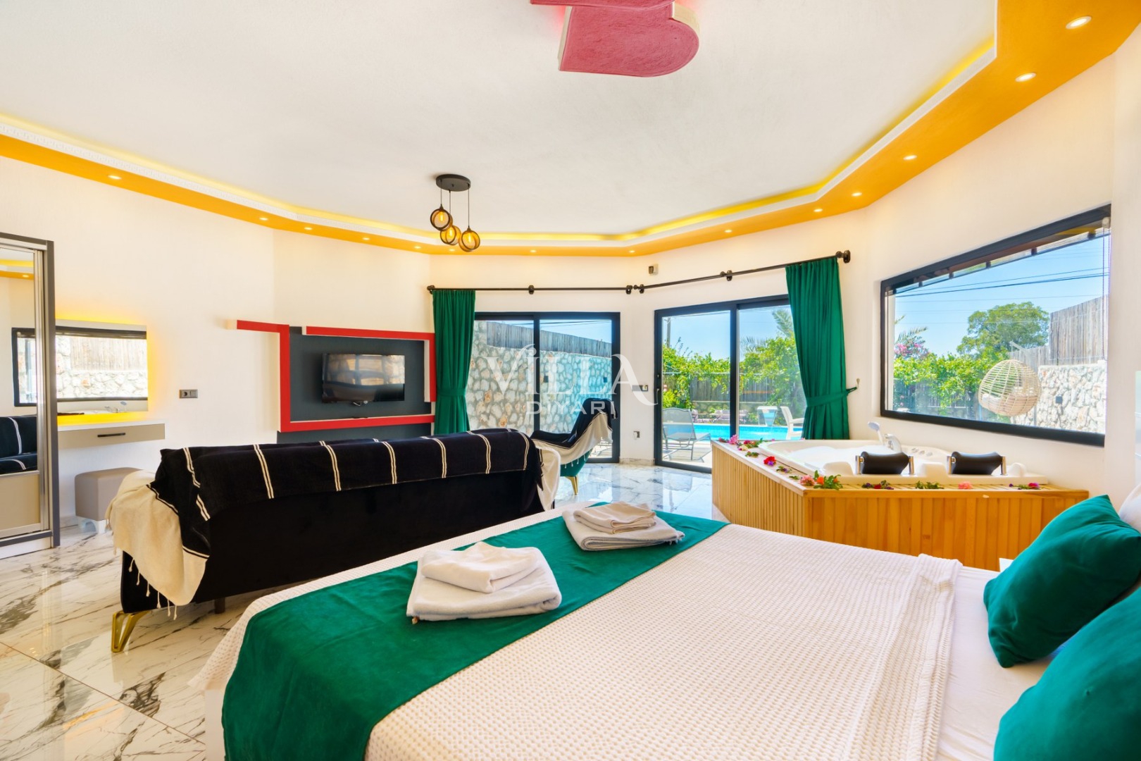 Havuzu korunaklı olarak belirttiğimiz villalarımızda kesinlikle %100 görünmeme garantisi vermemekteyiz. Bu villalarımızda her zaman %10 sakınma payı mevcuttur. Sitemizde bulunan villa fotoğraflarının, görüntüyü ekrana sığdırmak için ’Geniş Açılı Lens’ ile çekilmektedir. Bu sebeple resimlerdeki objeler, gerçek boyutlarından daha büyük veya küçük görünebilmektedir.
